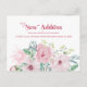Tarjeta postal de anuncio de mudanza floral bonita con peonías de acuarela, flores rosadas y vegetación botánica. El título dice "mi nueva dirección" (que se puede editar a "nuestra nueva dirección" si es necesario), seguido de su(s) nombre(s) y nueva dirección. Diseño atractivo con tipografía rosa decorativa y mensaje personalizado en el reverso.