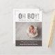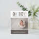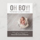 Tarjetas postales personalizadas de anuncio de nacimiento de bebé niño impresas de forma personalizada con tus fotos y texto. Este diseño minimalista moderno presenta tipografía en negrita en tonos de gris neutro y taupe con letras "Oh Boy!" y el nombre de tu bebé, estadísticas de nacimiento y foto debajo. El reverso tiene un patrón de rayas preppy o puedes usar el espacio para fotos y texto adicionales. Utiliza las herramientas de diseño para editar los colores y las fuentes o agregar más fotos para crear tus propias tarjetas de anuncio de nacimiento de niño únicas.