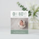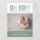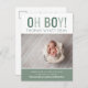 Tarjetas postales de anuncio de nacimiento de bebé niño personalizadas y impresas con sus fotos y texto a precios asequibles. Este diseño minimalista moderno presenta tipografía en negrita en tonos de verde salvia con letras "Oh Boy!" y el nombre de su bebé, estadísticas de nacimiento y foto debajo. El reverso tiene un patrón de rayas preppy o puede usar el espacio para fotos y texto adicionales. Utilice las herramientas de diseño para editar los colores y las fuentes o agregar más fotos para crear sus propias tarjetas de anuncio de nacimiento de niño únicas.