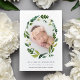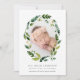 Elegantes anuncios botánicos de nacimiento muestran la foto de tu pequeño y dulce, rodeada por una corona oval de frondosas flores verdes y blancas. Personalice con el nombre de su bebé y las estadísticas de nacimiento que hay debajo.