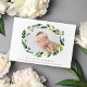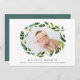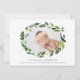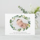Los elegantes anuncios botánicos de nacimiento incluyen la foto de tu pequeño y dulce (horizontal o orientada al paisaje) rodeada por una corona oval de frondosos follajes verdes y flores blancas. Personalice con el nombre de su bebé y las estadísticas de nacimiento que hay debajo.