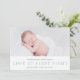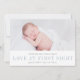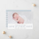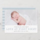 Las tarjetas de anuncios de nacimiento sencillas y modernas presentan tu foto favorita horizontal o paisajística para recién nacidos en un estilo de sangrado completo, con una banda blanca en la parte inferior que dice "amor a primera vista" en azul claro, flanqueada por el nombre y las estadísticas de nacimiento de tu pequeña. Los anuncios de natalidad de los niños retroceden a un sutil patrón a rayas en tonos azules pálidos.