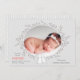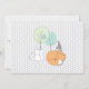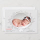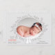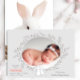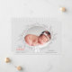 Derechos reservados © 2018 Socialite Designs Inc. & LICENCORS - Esta hermosa tarjeta de anuncio de nacimiento de una foto tiene conejitos de madera en el frente y una área de fotos rodeada por una simple corona. El color de fondo es un gris de paloma suave. La parte trasera tiene animales de bosque con fondo de polka-punto.