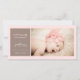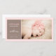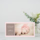 Presenta tu pequeña al mundo con este hermoso anuncio de nacimiento moderno de katkadoodle.com. Magnífica tipografía en rosa y blanco sobre marrón ante, ambientada en el fondo rosado más pálido. El estilo es simplemente elegante y cuenta con una foto retrato de tu dulce bebé.