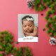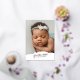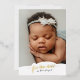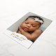 Anuncio de nacimiento con varias fotos con texto superpuesto de caligrafía con lámina metálica "Por este niño hemos orado", tarjeta de agradecimiento