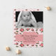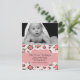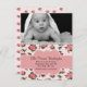 Elegante foto personalizado anuncio de nacimiento de bebé hecho en un patrón rosa rosado, con gráficos de un borde de encaje de marfil, en la parte superior. Una foto de bebé personalizado decora la parte superior, de la tarjeta plana, con un área de texto decorativa de banda rosa, a través del patrón floral, con texto negro listo para personalizar, con la información de nacimiento de su bebé. Una manera dulce y elegante de anunciar la llegada de su bebé, a amigos y familia.
