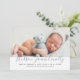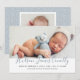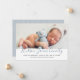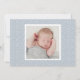 Tarjeta de anuncio de nacimiento con foto simple y moderna con letra manuscrita para el nombre del bebé niño y texto limpio para todos los detalles importantes del nacimiento. Una foto de paisaje en la parte frontal y una foto cuadrada en la parte trasera muestran a tu recién llegado. Un patrón de lunares abstractos blancos sobre un fondo azul suave y azul grisáceo pálido adorna la parte trasera de esta tarjeta de doble cara. Todos los colores del texto y del fondo son totalmente personalizables.