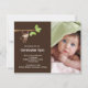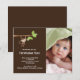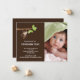 Nuestro pequeño mono ha llegado anuncio de nacimiento de bebé niño es una forma dulce de anunciar a familiares y amigos que ha llegado tu pequeño. La tarjeta de anuncio de foto presenta el monito más lindo colgado de una rama de árbol sobre un fondo marrón con un acento de lunares. ¡Agrega tu foto e información y listo! ©cocoa studio