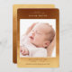 Elegante diseño moderno de anuncio de nacimiento de acuarela de estilo bohemio con detalles abstractos de color neutro naranja amarillo y marrón. Guión que introduce la línea y fuentes modernas de tipografía sans serif. Espacio en el frente para una gran foto junto con estadísticas de nacimiento que incluyen fecha y hora de nacimiento, así como peso, longitud y corta línea de los nombres de los padres. En el reverso se muestran dos espacios de fotos adicionales.