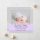 Anuncie el nacimiento de su hija con estilo con este adorable anuncio de nacimiento de foto de una niña. Con un moderno patrón de chevron gris y acentos de morado. Personaliza fácilmente con tu información. LA FOTO DE LA MUESTRA NO ESTÁ INCLUIDA. SUSTITÚYASE CON SU PROPIA FOTO ANTES DE PEDIRLA.