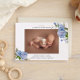 Tarjeta de anuncio de natalidad rústica con una foto de tu recién nacido con un ilustracion acuarela de flor azul claro con vegetación. Perfecto para un bebé de primavera o verano.