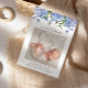 Tarjeta de anuncio de natalidad rústica con una foto vertical de su recién nacido con ilustracion acuarela de peonía azul claro con vegetación.