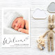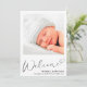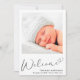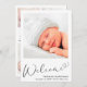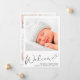 Un simple y elegante bebé al anuncio de nacimiento de una niña. La parte delantera incluye la foto del recién nacido, nombre completo, fecha de llegada y estadísticas de nacimiento, y "Bienvenidos" en un guión elegante con un corazón florecido. En el reverso de la tarjeta, agregue tres fotos más y nombres de padres y hermanos, y un mensaje de agradecimiento, visita u otro.