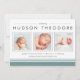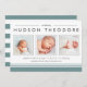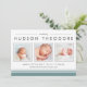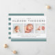 Anuncie la llegada de su dulce bebé con nuestros anuncios de nacimiento modernos y neutros estilo collage, que incluyen tres de sus fotos favoritas de recién nacidos en formato cuadrado, acentuadas con tipografías modernas y elementos rayados en verde suave negro y verde azulado. Personalice el nombre, las estadísticas de nacimiento y el mensaje familiar de su bebé utilizando los campos proporcionados.