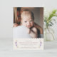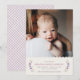 Anuncie la llegada de su hermosa bebé con este simple y dulce anuncio de nacimiento. El nombre de su bebé, así como la información de nacimiento, está enmarcado por una guirnalda de delicadas flores y hojas. La parte superior del diseño presenta un borde ondulado y bonito. También hay espacio para una gran foto de su nueva adición. La parte posterior de la tarjeta presenta un patrón de cuadros púrpura dibujado a mano. Asegúrese de revisar el sobre coordinado con dirección propia.