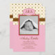 Anuncio de nacimiento personalizado moderno para una niña. Agrega tu propia foto y palabras. Cuenta con monogramas de iniciales del bebé y un fondo de lunares lindos en rosa y marrón. Elegante pero juguetón.