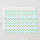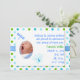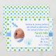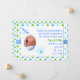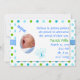 Anuncio de nacimiento de adorable bebé varón hecho en lunares azules, verdes y turquesa, sobre un fondo blanco. Un área de texto blanca, sobre el fondo de lunares, tiene un pequeño marco de foto ovalado cortado, en el lado izquierdo, con gráficos lindos de una libélula azul y una mariposa colorida alrededor del marco. El texto en azul y verde está listo para personalizarse con la información de su bebé. Dulce manera de anunciar la llegada de su pequeño Príncipe.