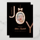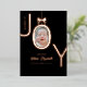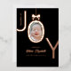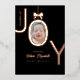Tarjeta de vacaciones de hoja de aluminio con rosa real Bundle of JOY con la foto de su bebé recién nacido dentro de la O diseñada para parecerse a un adorno con un lazo en la parte superior. Fondo negro con letras de hoja de aluminio de rosa real hace que este anuncio de nacimiento sea elegante y moderno, y será un placer recibir de sus amigos y familiares junto con los datos de nacimiento y 2 fotos de su nuevo bebé.