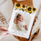 Tarjeta de anuncio de natalidad rústica con una foto vertical de tu recién nacido con un ilustracion acuarela de girasoles amarillos con aliento de bebé.