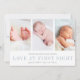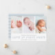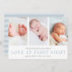 Las tarjetas de anuncio de nacimiento sencillas y modernas incluyen tres de tus fotos favoritas de recién nacidos alineadas una al lado de la otra, con una banda blanca a lo largo de la parte inferior que dice "amor a primera vista" en azul pastel, flanqueada por el nombre y las estadísticas de nacimiento de tu pequeña. Moda los anuncios de natalidad de los bebés se revertirán a un sutil patrón a rayas en tonos azules a juego.