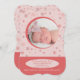 Un dulce anuncio del nacimiento de una foto para presentar a tu pequeño. Delicados copos de nieve y una ventana de fotos redonda con colores rosa y berry crean el diseño. (FP)