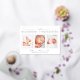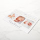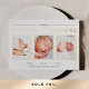 Los anuncios de nacimiento modernos y elegantes incluyen tres fotos de recién nacidos alineadas una al lado de la otra y recortadas con Relieve metalizado dorado, con el nombre del bebé en la parte superior con letras de Relieve metalizado dorado. Personaliza con las estadísticas de nacimiento de los bebés debajo.