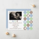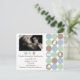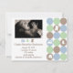 Anuncio de nacimiento con foto de punto adorable y masculino, perfecto para un bebé varón. Sube tu foto digital y agrega tu texto personalizado. Características suaves círculos de color azul polvo, salvia y marrón arenoso con silueta de osito de peluche, coche de juguete, pájaro y elefante. ¡Estilo super adorable!