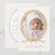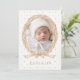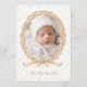 Corona de vid antigua pintada con suaves acuarelas. Colores neutros y un lazo de arpillera para terminar. Agregue el nombre del bebé para personalizar. El reverso tiene un patrón de lunares coordinados neutros con un marco ovalado doble con todos los datos del bebé. Perfecto para un anuncio de nacimiento de niño o niña.