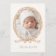 Un pintoresco wreath de parra vintage realizado en suaves acuarelas. Colores neutros y un lazo de arpillera para terminar. Agregue el nombre del bebé niño o niña para personalizar. El reverso tiene un patrón de lunares coordinado neutral con un marco doble de forma ovalada con todas las estadísticas del bebé. Perfecto para un anuncio de nacimiento de niño o niña.