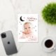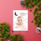 Un diseño lúdico y elegante que presenta una foto en forma de arco moderno, emparejada con fuentes elegantes, estrellas dibujadas a mano, nubes y una luna creciente. En la parte trasera hay un collage de 3 fotos y más estrellas. Asegúrese de visitar la colección para ver más.