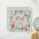 Presentación de pequeño bebé niño anuncio verde polvoriento con adorables animales del bosque, flores y pájaros. Obra original de Caroline Bonne Müller