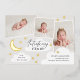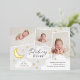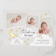 Un diseño divertido y elegante de anuncios de nacimiento que presenta un collage de 3 fotos con un guión elegante de caligrafía y estrellas dibujadas a mano, nubes y luna creciente. Las estrellas y la luna tienen un verdadero Relieve metalizado (color de tu elección). Todos los colores se pueden editar utilizando las herramientas de edición.