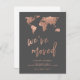 Estas elegantes tarjetas postales de cambio de dirección presentan un mapa de falso oro rosa de los continentes sobre un fondo gris ahumado. La tipografía moderna a juego añade otro toque de estilo. ¡Personalice fácilmente con toda la información de su nueva dirección!
