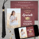 Comparte la alegría de una escuela secundaria o graduación universitaria con esta foto personalizado de invitaciones borgoñas, doradas y blancas. (IMAGEN PLACEMENT TIP: Una manera fácil de centrar una imagen exactamente como se desea es recortarla antes de subirla al sitio web de Zazzle.) Esta plantilla es sencilla para el personalizar con cualquier texto de su elección, como detalles de la invitación a la fiesta, nombres de los padres, honores especiales, título de grado, cotización inspiradora favorita, información de contacto del graduado, planes de educación futuros o nueva posición laboral. Si hay algún texto que no se desee simplemente borrarlo. El diseño presenta un fondo rojo oscuro marrón, una tapa de tablero de mortero de Relieve metalizado dorado falso, caligrafía de escritura a mano, tipografía minimalista moderna y una foto de su elección, como una foto de la tercera edad o una imagen de la ceremonia de inicio. Tenga en cuenta que el oro es color impreso, no Relieve metalizado metálico. Estas elegantes tarjetas de invitación de graduación son una forma moderna y moda de compartir tu celebración especial del día con la familia y amigos. ¡Felicitaciones al graduado!