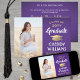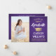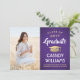 Comparte la alegría de una graduación de escuela secundaria o universidad con estos anuncios personalizados de fotos en púrpura, dorado y blanco. (CONSEJO PARA COLOCAR LA IMAGEN: Una forma fácil de centrar una imagen exactamente como la deseas es recortarla antes de subirla al sitio web de Zazzle.) Esta plantilla es fácil de personalizar con cualquier texto que elijas, como detalles de la invitación a la fiesta, nombres de los padres, honores especiales, título del grado, cita inspiradora favorita, información de contacto del graduado, planes de educación futura o nuevo puesto de trabajo. Si hay algún texto que no se desee, simplemente elimínalo. El diseño presenta un fondo de ombre púrpura, gorra de graduación de oro con efecto de lámina, caligrafía con estilo de letra manuscrita, tipografía minimalista moderna y una foto de tu elección, como una foto de último año o imagen de la ceremonia de graduación. Ten en cuenta que el dorado es un color impreso, no lámina metálica. Estas tarjetas de anuncio de graduación elegantes son una forma moderna y chic
