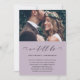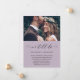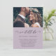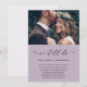 Sencillo cambio de fecha anuncio de postergación de boda. Este anuncio simple es una forma elegante de informar a los invitados que la fecha de su boda ha sido reprogramada debido a circunstancias imprevistas, e incluye la nueva fecha de la boda. Este anuncio de moda presenta una hermosa letra de caligrafía negra "aún nos casamos" sobre un fondo morado ahumado con la foto de la pareja, y un reverso de tarjeta blanco con tinte morado suave.