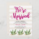 Esta elegante y divertida invitación para la recepción después de la boda cuenta con ilustraciones de cactus, con tipografía rosa oscuro sobre un fondo a rayas neutro, para un look desértico glamoroso. Arte a rayas de Indie Grace Designs.