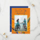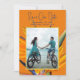 Anuncios de boda para salvar nuestra fecha con flores de ave de paraíso y plantilla de foto. Una tarjeta llamativa con orientación vertical y foto enmarcada sobre un fondo de brillantes flores hawaianas naranjas. Se utilizan fuentes modernas en color azul oscuro. Azul oscuro a juego en la parte posterior con otra imagen floral. Una foto de la pareja elimina la necesidad de nombres, o agrega nombres a las líneas de fecha y ubicación. Este diseño también viene como descarga instantánea.