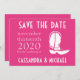 Anuncios de "Cowboy Boot Save The Date" (Hot Dark Pink / Blanco)...Estos anuncios de "save the date" con botas de vaquero o vaquera son la forma perfecta de pedirle a amigos y familiares que guarden la fecha de su próxima boda. Perfecto para la novia y el novio que tienen una recepción de boda con tema country western o vaquero. El diseño presenta una divertida bota de vaquero. ¡Perfecto para la pareja que se casa en un rancho o en un caballo! Genial para bodas de destino. Vea WindyCityStationery.com para nuestra línea completa de anuncios de "Cowboy Boot" save the date en una amplia gama de colores, así como sellos postales "Cowboy Boot", tarjetas de agradecimiento, etiquetas de dirección de devolución, imanes de "save the date" y más.