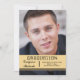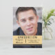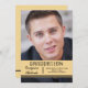 Una moderna invitación de graduación con la palabra "Graduación" en un patrón intrincado. La base dorada tiene dos líneas horizontales en la parte inferior.