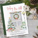 Todo en una invitación de vacaciones en movimiento y tarjeta de navidades personalizada con su nueva dirección y saludos de navidades. Está escrito con Salones Nuevos Decking en escritura informal. El diseño acuático cuenta con una puerta principal festiva con corona, número de puerta, árbol de navidad, regalos, snowman y linterna.