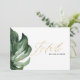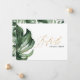 Tarjeta de detalles de boda de follaje tropical de hoja de palma en acuarela. Un diseño elegante, que es parte de una colección de bodas modernas minimalistas de moda. Con texto de letra con efecto dorado.