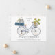 Tarjeta de anuncio de mudanza divertida con ilustración de acuarela de una bicicleta cargada con equipaje y plantas de interior. El diseño está escrito con tipografía de fuente delgada y caprichosa y es totalmente editable. El texto de muestra dice "Estoy en movimiento... ¡ponte al día conmigo en mi nueva dirección!", que puedes mantener o editar como desees, así como agregar tu nombre(s) y nueva dirección.