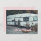 Muestra un viejo remolque blanco y "Nos hemos mudado". Personalice y personaliza la nueva dirección y la información de contacto. El color de fondo es rosa y también se puede personalizar. Diseño divertido para hacer que una mudanza agotadora sea más divertida.