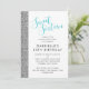 Glamorosas, modernas, bonitos y simples invitaciones de cumpleaños de rayas purpurinas de color gris plateado. Girly pero no frilly para una celebración de cumpleaños de agua azul dulce y plata adolescente. Se muestra para un dulce cumpleaños de 16 años, pero todo el texto es editable para cualquier invitación de cumpleaños adolescente. ・ ・ ・ ・ ・ ・ ・ ・ ・ ・ PERSONALIZAR DE TODAS LAS CUESTIONES DE TI haciendo clic en "Personalizar", que incluye: fuentes, color de texto, color de fondo y posicionamiento purpurina en el frente y la parte posterior. ・ ・ ・ ・ ・ ・ ・ ・ ・ Compruebe la colección de diseñadores para coordinar los elementos decorativos de la fiesta de cumpleaños.