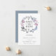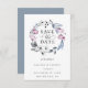 Elegante corona de acuarela, Boda Guardar la tarjeta de fecha. Flores, flores delicadas y follaje en tonos polvorientos de azul, malva, gris y blanco. Se puede personalizar el color de los respaldos, mostrado en azul polvoriento.