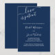 Tarjeta de anuncio de aplazamiento de boda con paleta de colores minimalista en azul marino y blanco. "El amor es paciente", junto con los nombres de la novia y el novio, está escrito a mano en elegante letra cursiva. La plantilla está configurada para que personalice el mensaje de actualización de su boda según sea necesario. La redacción de la muestra dice "debido a eventos recientes, la boda de [sus nombres] se ha pospuesto. Les haremos saber tan pronto como establezcamos una nueva fecha. Fue una decisión difícil y agradecemos su comprensión" - que puede mantener o editar como desee.