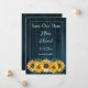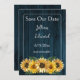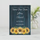 Personalice una invitación boda única con un girasol azul rústico Save the Date. El diseño de la invitación cuenta con un fondo rústico de madera y un elegante ramo de girasoles. Además, guarde el anuncio de fecha disponible para este diseño en una variedad de colores.