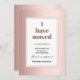 Una rosa de oro ondulado y femenina de aspecto metálico falso fondo. Con el texto: me he movido. Personalice y agregue su nueva dirección y nombre. Guión minimalista y moderno, fuentes. Letras de oro y negro rosa oscuro.
