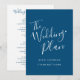 El plan de boda azul y blanco lista simple para que los invitados tengan un orden de eventos para su recepción o boda. Ideal para usar como tarjeta de boda para informar a sus invitados de los momentos de la boda durante su evento, para que sepan qué está sucediendo y en qué orden. El texto se puede cambiar para adaptarse a sus necesidades y horario de recepción. Otras opciones de color están disponibles. Diseño original de Sarah Trett para www.mylittleedenweddings.com en Zazzle.